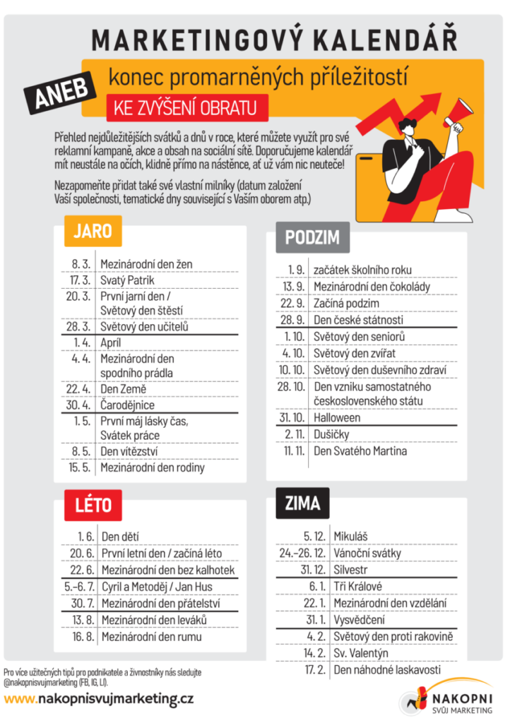 Stáhněte a vytiskněte si marketingový kalendář, ať ho máte vždy na očích. Doplňte si i klouzavé svátky, které se každý rok mění a často zaskočí: